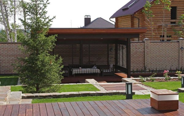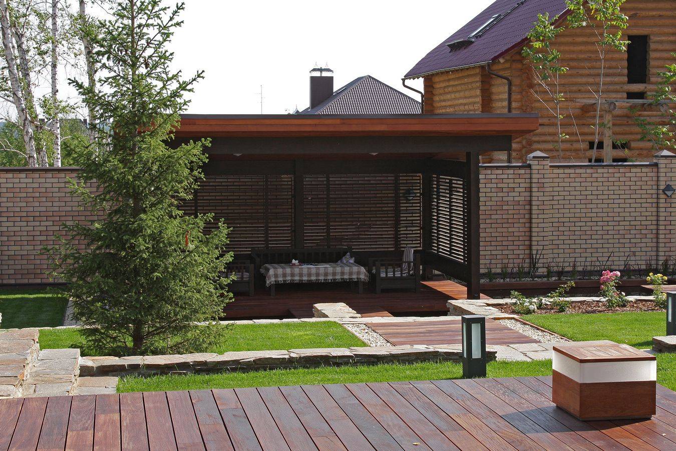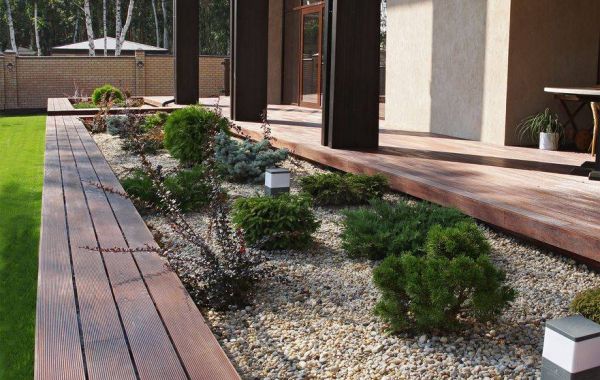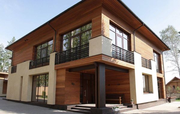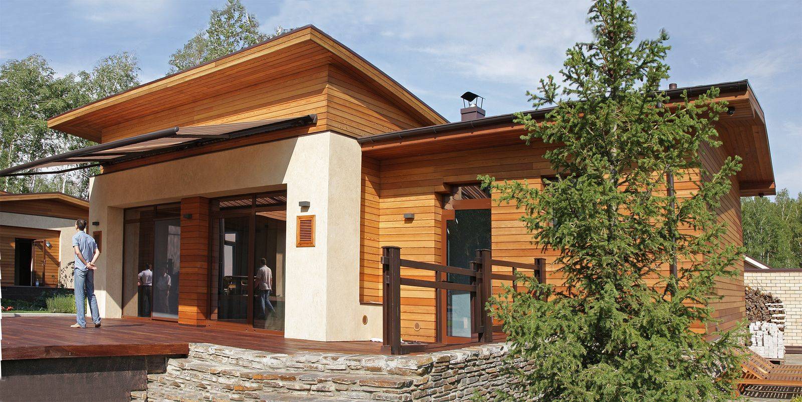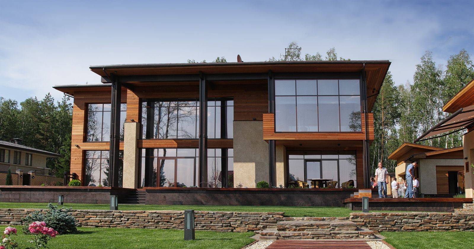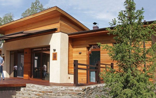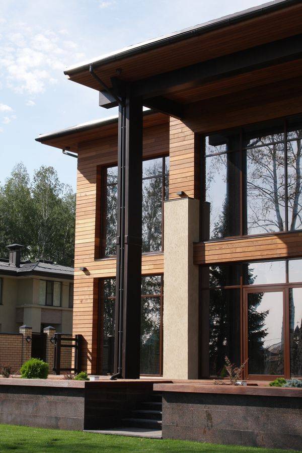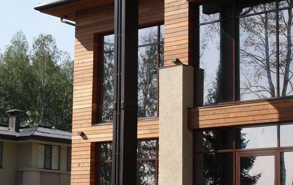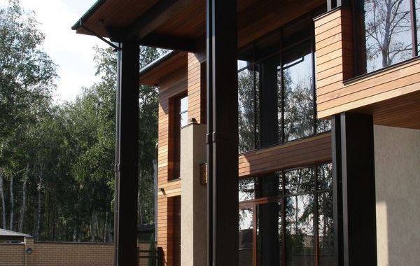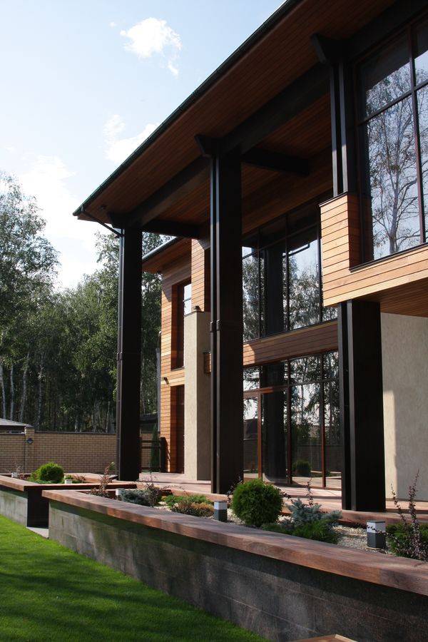 Основным лейтмотивом в разработке эскизного проекта дома стала тема связи с природой. Лаконизм форм, натуральные материалы, применённые в отделке дома, подчёркивают его органичность с окружающей средой, сосновым лесом. Обилие стеклянных витражей даёт возможность наслаждаться незабываемыми видами, не выходя из гостиной-кухни, спальни и кабинета, а сочетание контрастных оттенков лиственницы на фасадах повторяет цветовую гамму стволов сосен, опять апеллируя к природному началу в разработке концепции дома. Перед главным выходом из дома на участок разместили рокарий с низкорастущими растениями, обшитый террасной доской, которой отделана зона отдыха перед домом. Рядом расположился гостевой домик с баней, выполненный в той же скандинавской стилистике, и беседка, размещённая на искусственном водоёме.
