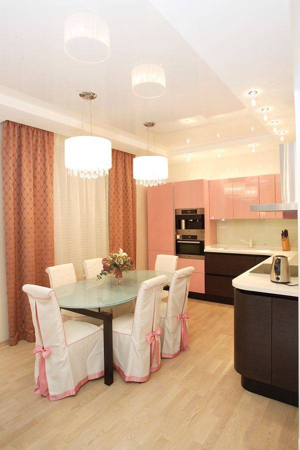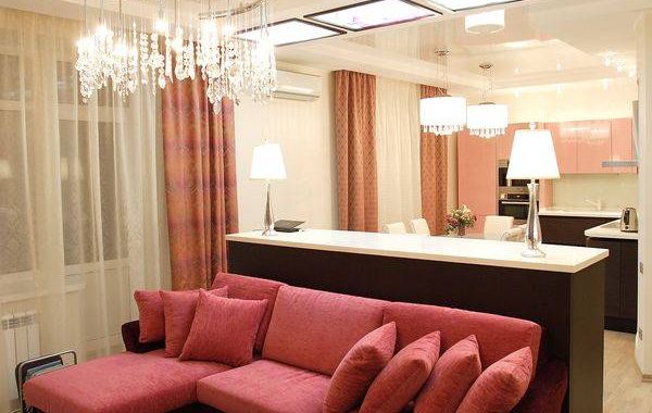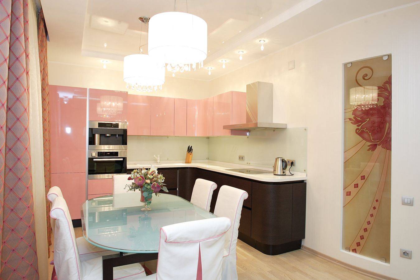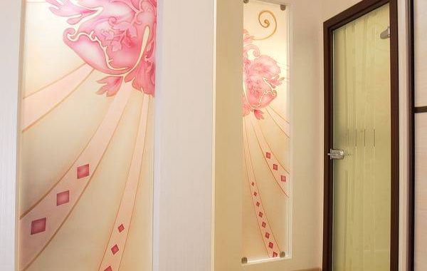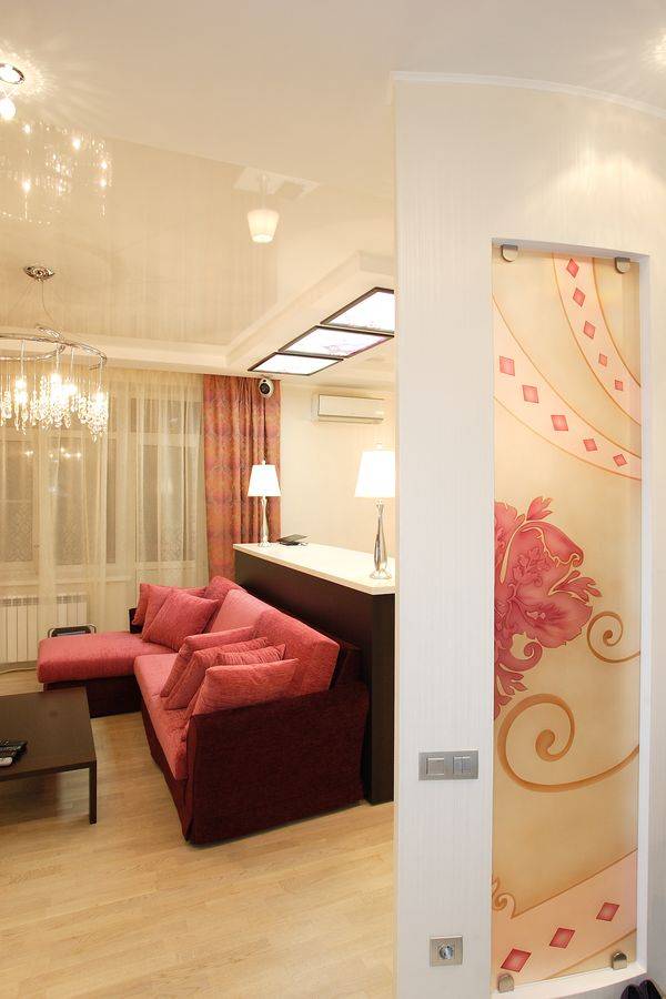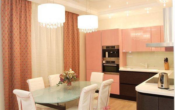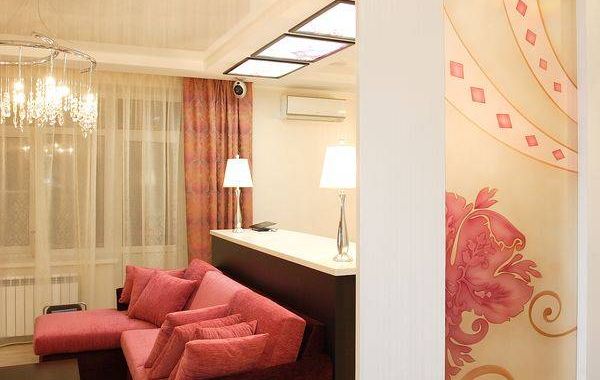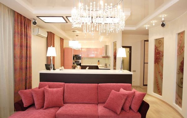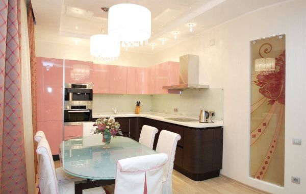 В работе над проектом дизайна квартиры основной задачей было не просто грамотно спланировать пространство, но и создать среду, которая полностью соответствовала бы характеру и образу жизни ее хозяйки. К слову сказать, дизайн интерьера был разработан для постоянной клиентки мастерской, молодой женщины, обладающей прекрасным вкусом. Главным пожеланием заказчицы являлась функциональная организация пространства. Поскольку изначально планировка квартиры была свободной, нам не составило большого труда расположить помещения удобно и разместить в них все необходимое в соответствии с требованием клиентки. Увеличить пространство было решено объединением кухни с гостиной. Эти две зоны разделены лишь барной стойкой и витражным потолком. Элегантность интерьера подчеркивают глянцевые поверхности натяжные потолки, кухонные фасады, стекло с росписями. В цветовой гамме интерьера доминирует розовый в сочетании с темно-коричневым венге. Активное участие в цветовой палитре принимает стекло с росписями, расположенное в перегородках кухни-гостиной и потолке над барной стойкой. Немаловажная составляющая интерьера этой квартиры свет от фабрик Orion, Kolarz и Linea Light, предоставленный нашей мастерской. Люстры и встроенные светильники с кристаллами Swarovski в гостиной подчеркивают утонченность и женственность интерьера, поражая взгляд россыпью различных бликов. А искусственные композиции из цветов, созданные фирмой «Орхидея», стали своеобразными акцентами, которые привносят тепло и уют, оживляя интерьер этой очаровательной квартиры.