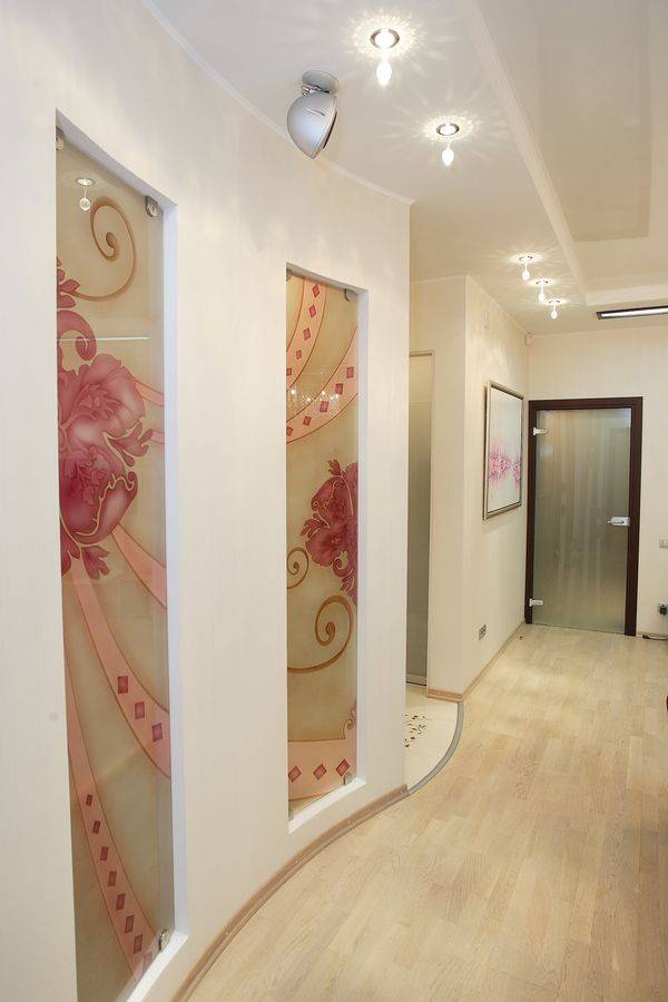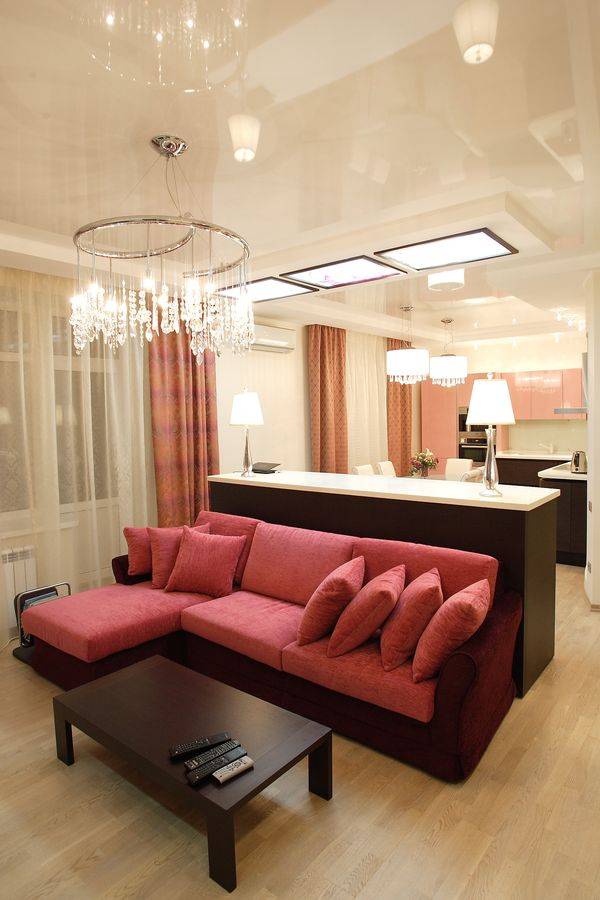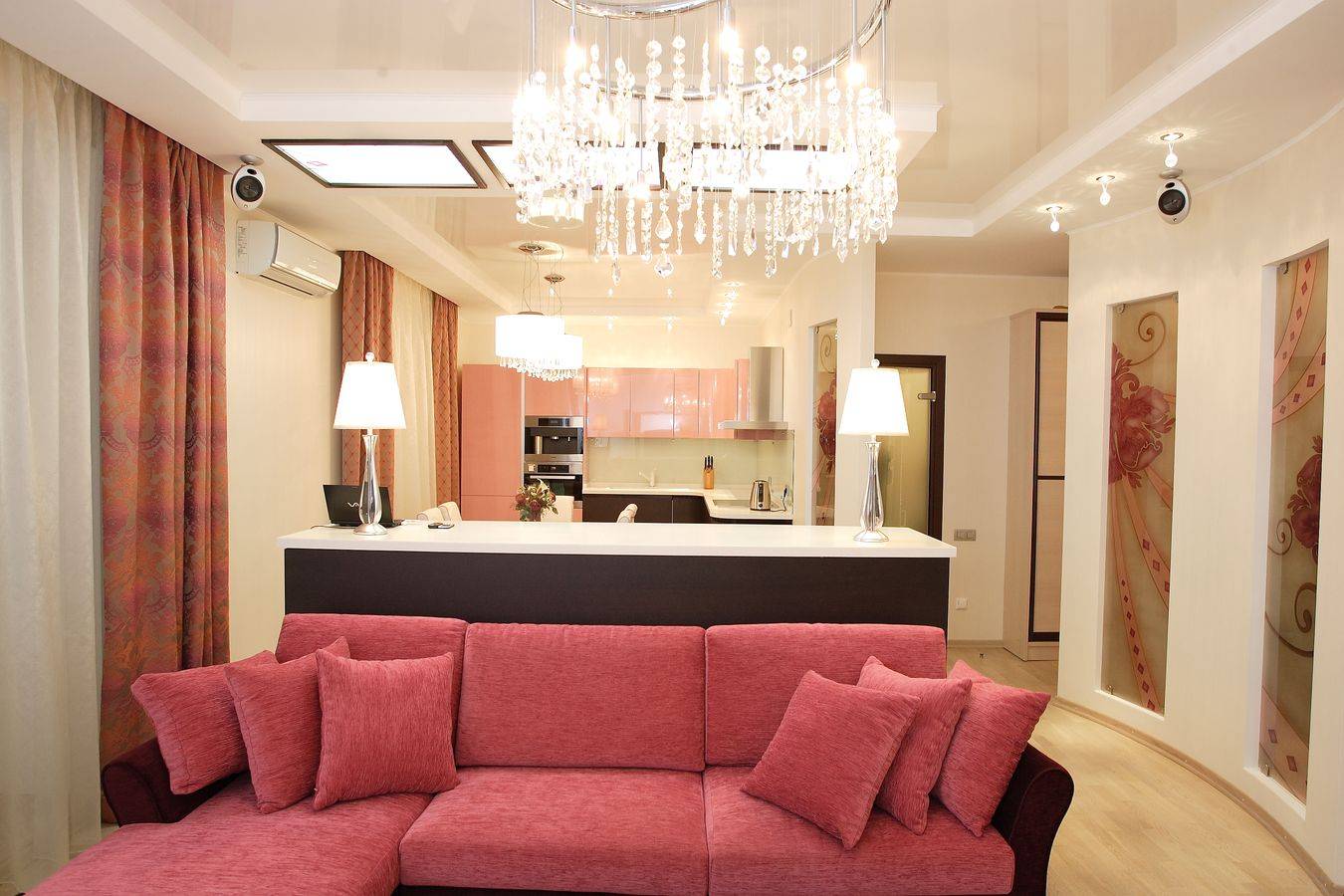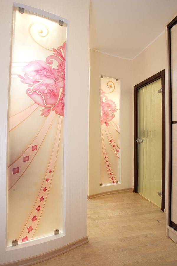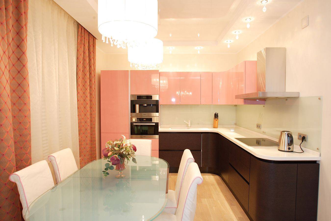 В работе над проектом дизайна квартиры основной задачей было не просто грамотно спланировать пространство, но и создать среду, которая полностью соответствовала бы характеру и образу жизни ее хозяйки. К слову сказать, дизайн интерьера был разработан для постоянной клиентки мастерской, молодой женщины, обладающей прекрасным вкусом. Главным пожеланием заказчицы являлась функциональная организация пространства. Поскольку изначально планировка квартиры была свободной, нам не составило большого труда расположить помещения удобно и разместить в них все необходимое в соответствии с требованием клиентки. Увеличить пространство было решено объединением кухни с гостиной. Эти две зоны разделены лишь барной стойкой и витражным потолком. Элегантность интерьера подчеркивают глянцевые поверхности натяжные потолки, кухонные фасады, стекло с росписями. В цветовой гамме интерьера доминирует розовый в сочетании с темно-коричневым венге. Активное участие в цветовой палитре принимает стекло с росписями, расположенное в перегородках кухни-гостиной и потолке над барной стойкой. Немаловажная составляющая интерьера этой квартиры свет от фабрик Orion, Kolarz и Linea Light, предоставленный нашей мастерской. Люстры и встроенные светильники с кристаллами Swarovski в гостиной подчеркивают утонченность и женственность интерьера, поражая взгляд россыпью различных бликов. А искусственные композиции из цветов, созданные фирмой «Орхидея», стали своеобразными акцентами, которые привносят тепло и уют, оживляя интерьер этой очаровательной квартиры.